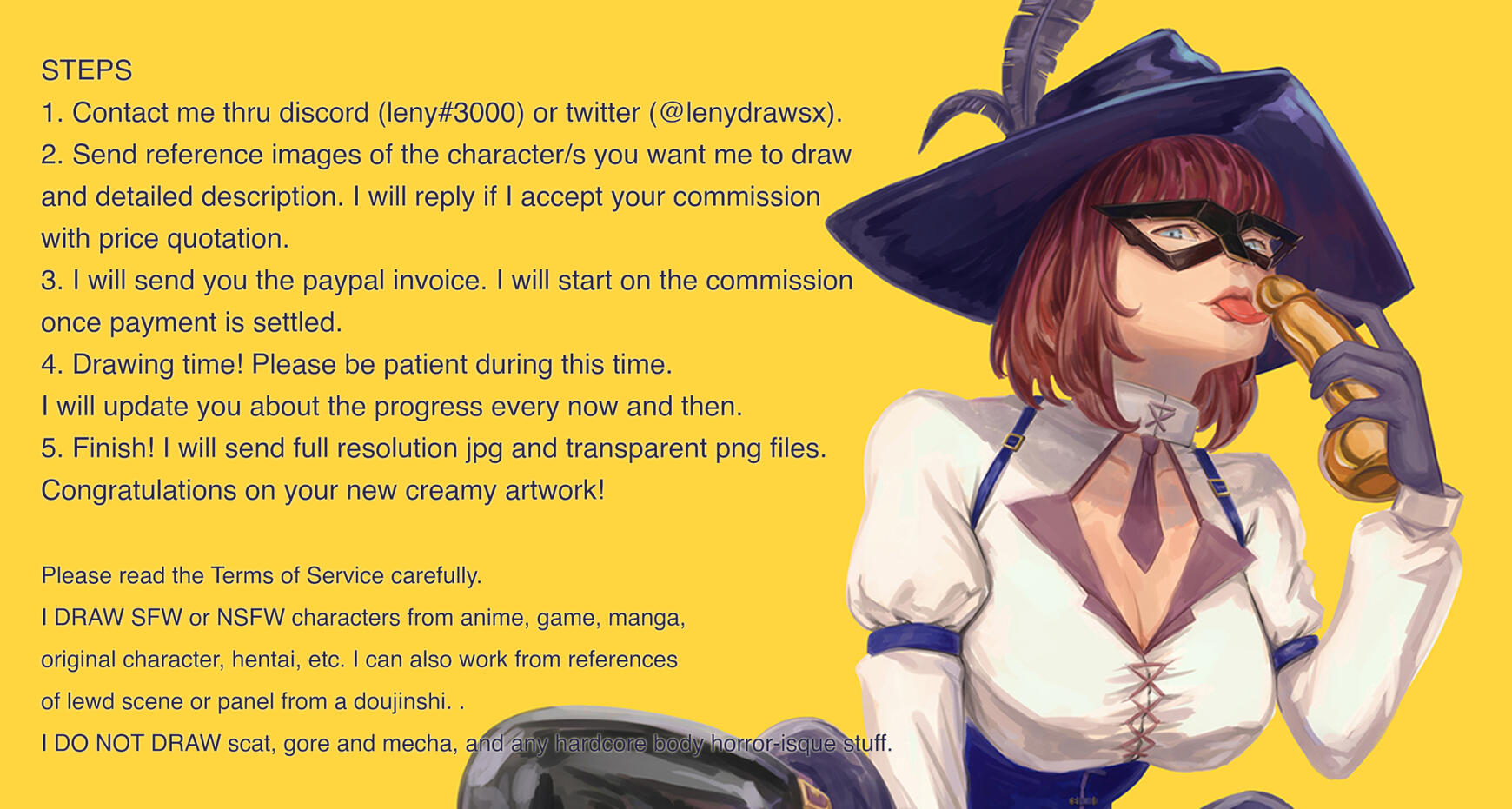 2. Send reference images of the character/s you want me to draw and detailed description, along with what type of commission on discord (leny#3000) or DM me on twitter (@lenydrawsx). I will reply if I accept your commission along with price quotation and timeline on when I can work on your piece.